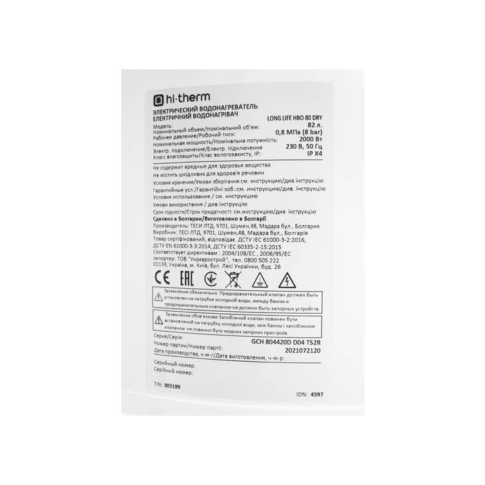 Водонагреватель hi-therm Long Life HBO 80 DRY (2023)