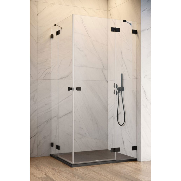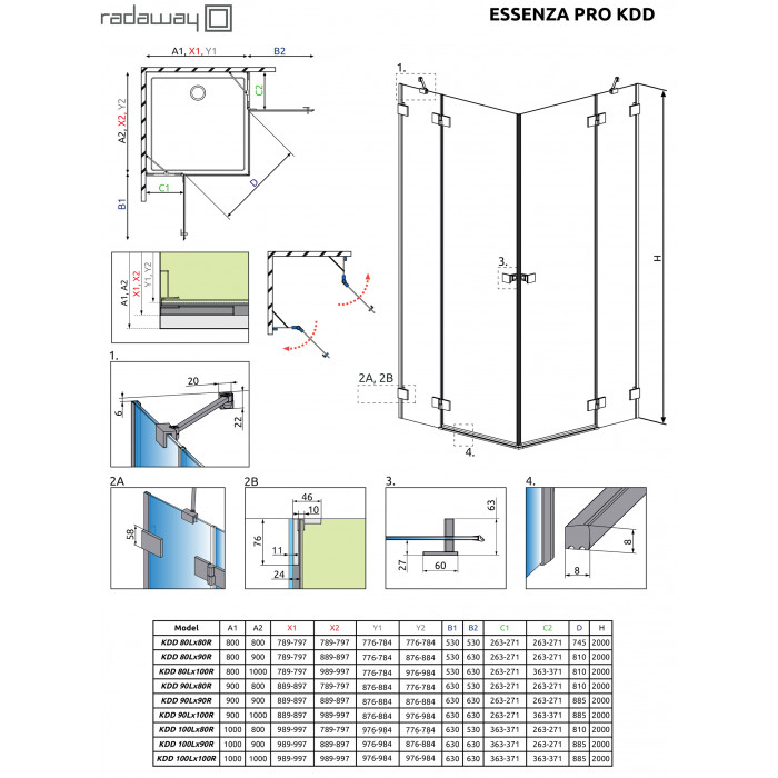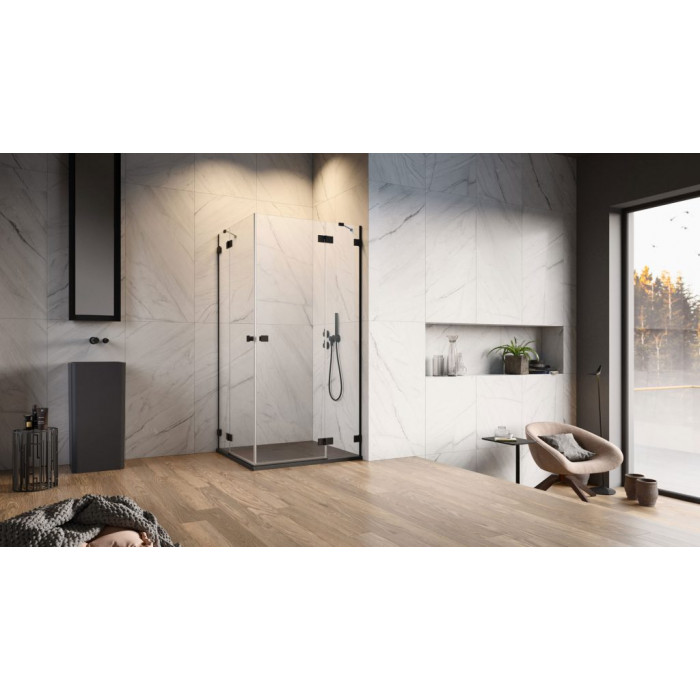 Essenza Pro — коллекция кабин разных форм, дверей и шторок, в которых стационанрое стекло закреплено к стене с помощью кронштейна, а не профиля. Допустимы два варианта монтажа: с уплотнительным профилем, или без него. Створка двери подвешена на латунных петлях и открывается только наружу.