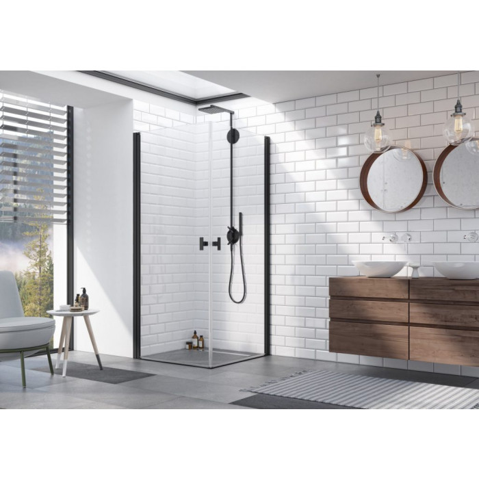 Nes Black — это кабины, двери и шторки на ванну — с фурнитурой в цвете «Black». Дополнительно несколько моделей Nes Black доступно со стеклом Frame/Factory на котором черные полоски изготовлены из устойчивой, керамичной краски.