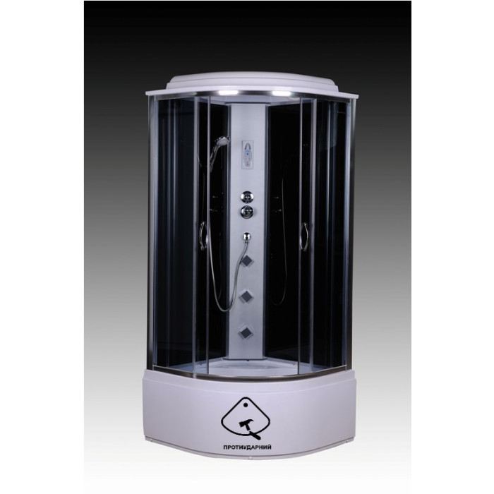 Розмір: 90х90х220 см. Компактні розміри боксу дозволяють зручно розмістити його навіть у невеликих ванних кімнатах, забезпечуючи при цьому достатньо простору для комфортного прийняття душу.