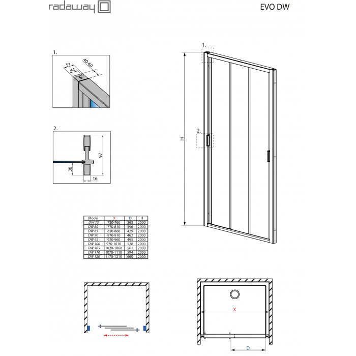 Коллекция Evo это практические раздвижные двери для любой, но особо для маленьких ванных комнат. Благодаря 3-секционной раздвижной двери даже при узких проемах (75-90), вход довольно широкий. Трех-секционная раздвижная дверь смонтирована уже на фабрике. В ванной комнате достаточно присверлить к стене.