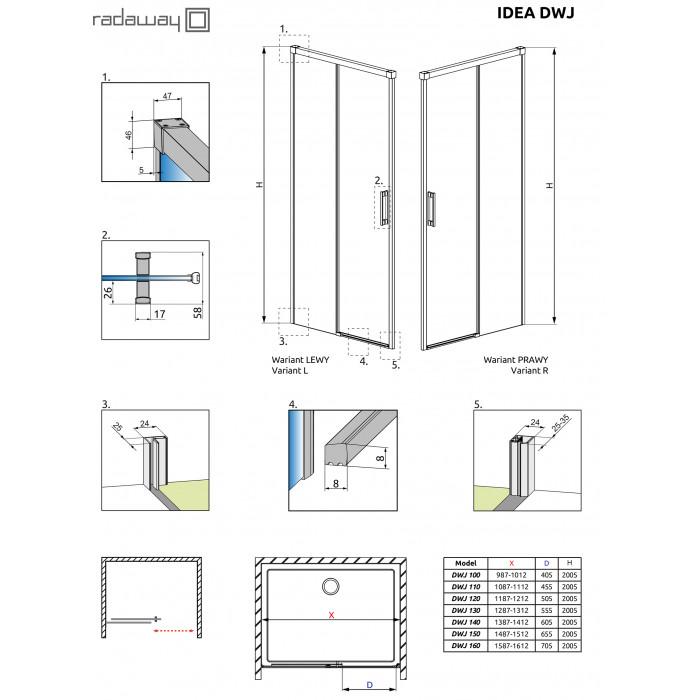 Коллекция Idea это новинка 2016г. в ассортименте Radaway. Первая коллекция в стиле настоящего минимализма — двойные ролики спрятаны внутри профилей, на пристенных профилях отсутствуют даже заглушки болтов — в место них маскоровочная лента Nastro Chromo. Все изделия из этой коллекции допускается устанавливать как на поддон так и непосредственно на пол. Кроме того, все изделия допускается устанавливать с порогом или без порога меняя нижний фиксатор (в комплекте).