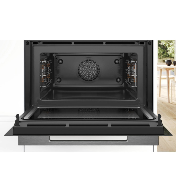 Головною особливістю Bosch CMG 7241W1 є наявність функції НВЧ (мікрохвильової печі), що дозволяє швидко розігрівати або готувати страви. Потужність мікрохвиль складає 900 Вт, що забезпечує ефективний розігрів та готування страв навіть у режимі духовки. Це значно розширює функціональні можливості приладу, дозволяючи комбінувати різні способи приготування їжі для досягнення ідеального результату.