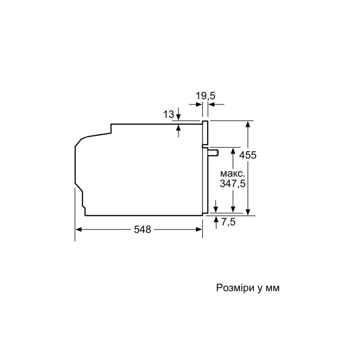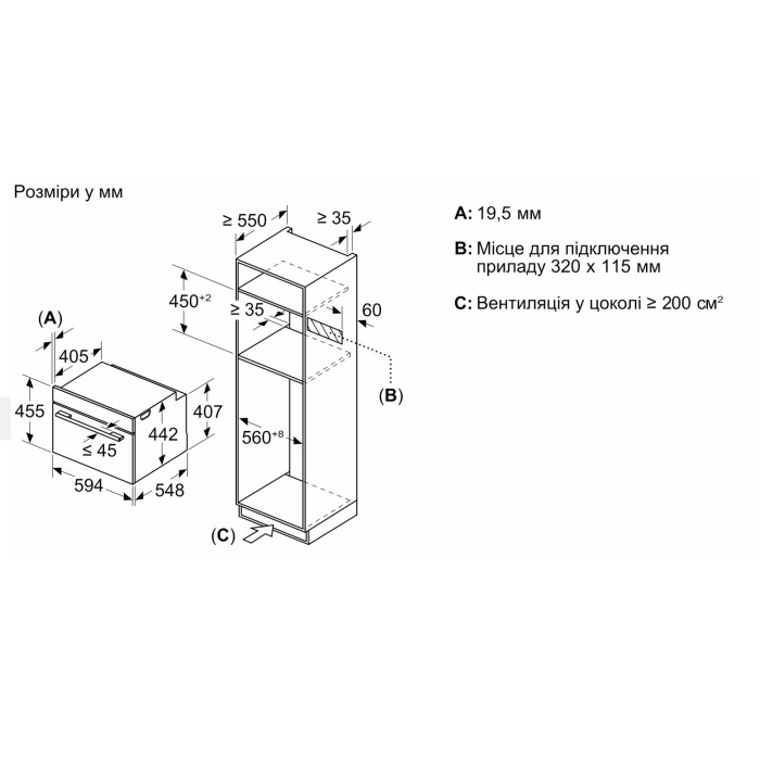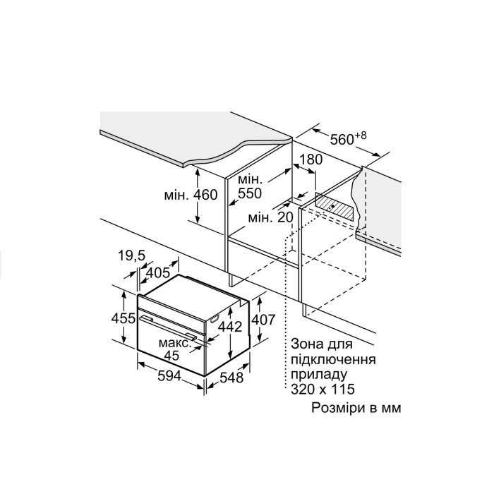 Прилад має стандартну ширину вбудовування 60 см, що робить його зручним для інтеграції в більшість кухонних гарнітурів. Внутрішній об’єм становить 45 літрів, що є достатнім для приготування різноманітних страв, включаючи випічку, запікання та гриль.