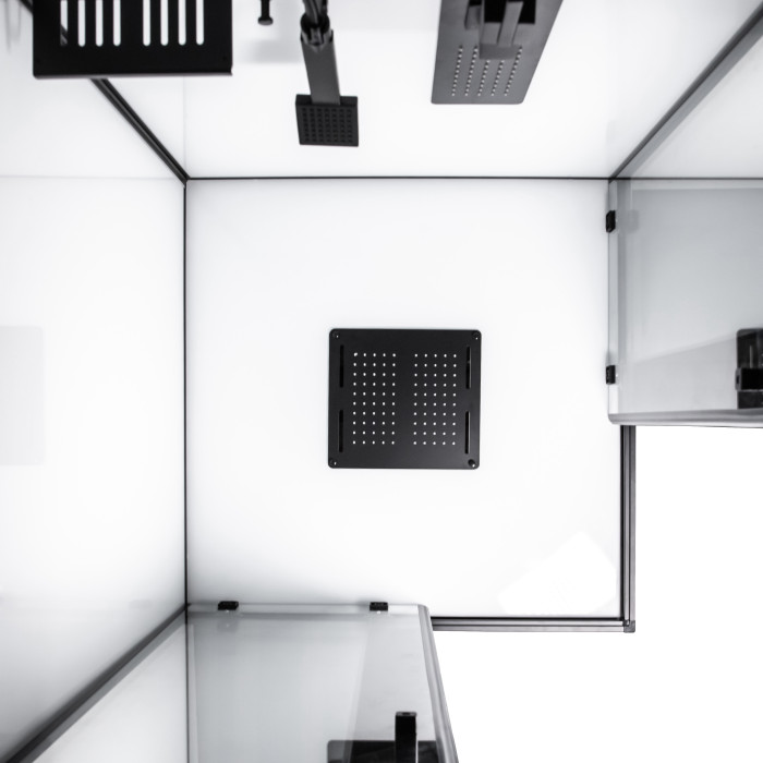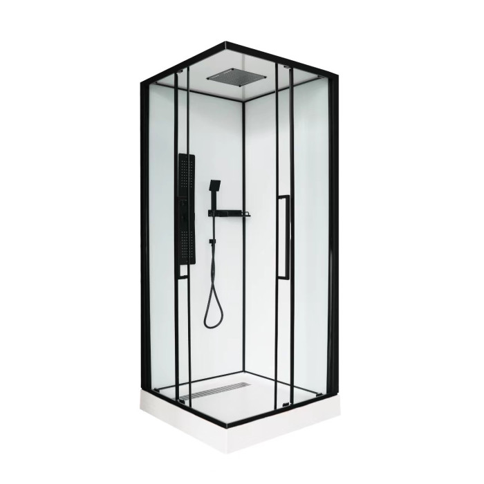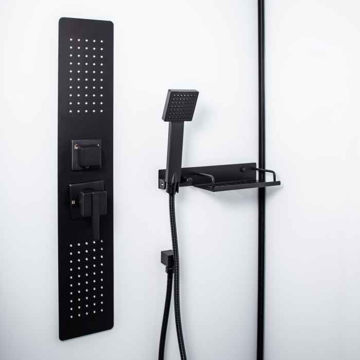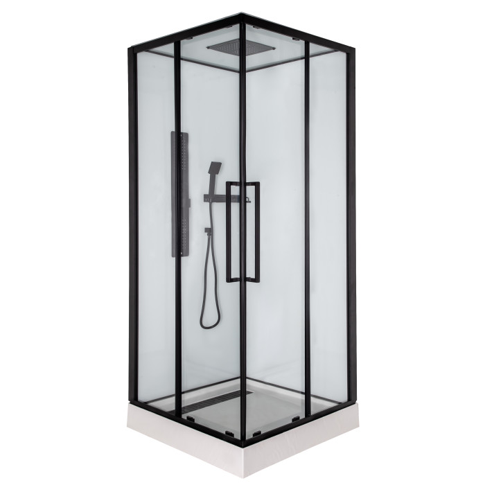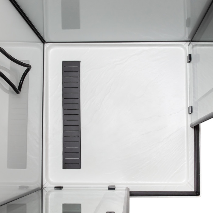 Полная комплектация: Бокс оснащен 3-режимным смесителем, квадратным ручным душем и тропическим душем в потолочной панели.