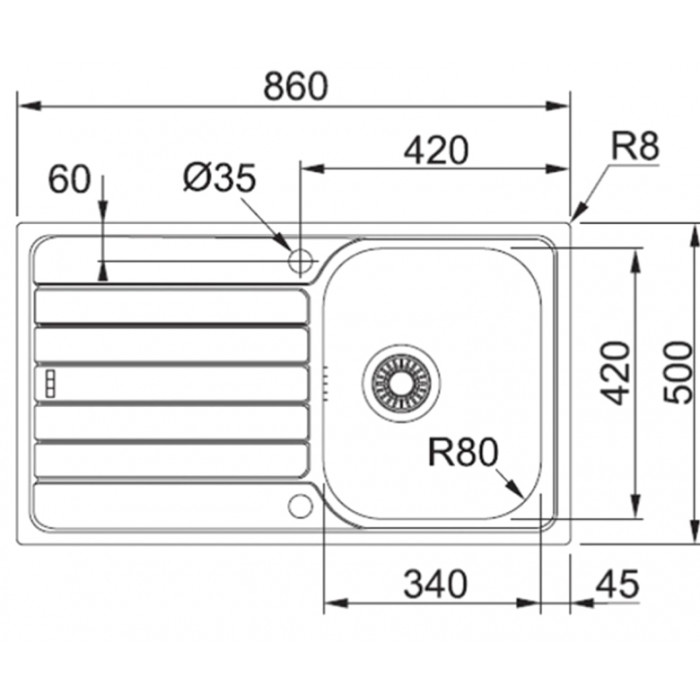 Размер мойки 860х500 мм