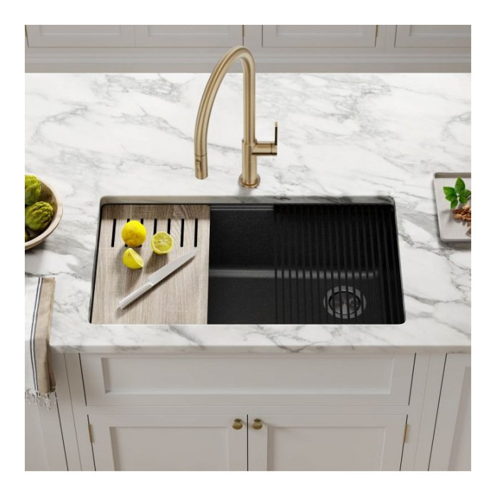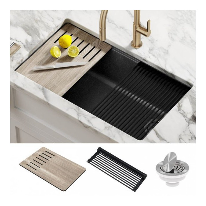 Кварцево-композитная рабочая станция Kraus KGUW2-33MBL отличается высокой прочностью и солидным внешним видом, что в сумме добавит больше функциональности Вашей кухне и обеспечит удобство в процессе эксплуатации. Представленный аксессуар оснащается встроенным выступом и набором аксессуаров (разделочная доска, сушка, клапан для слива, фиксаторы), которые легко скользят по поверхности, экономя свободное пространство помещения.