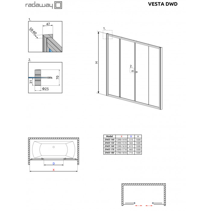 Vesta — это серия душевых шторок с раздвижной конструкцией и механизмом двойных подшипниковых роликов для плавного хода двери. Шторка включает в себя четыре секции. Два фиксированных стекла по бокам и две подвижные дверцы.