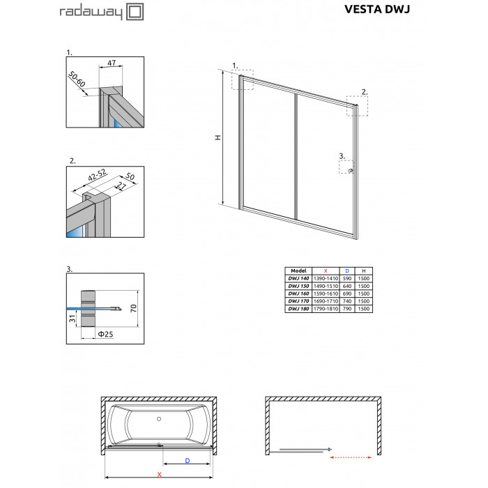 Vesta — это серия душевых шторок с раздвижной конструкцией и механизмом двойных подшипниковых роликов для плавного хода двери. Модель Vesta DWJ это одностворчатая шторка на ванну.