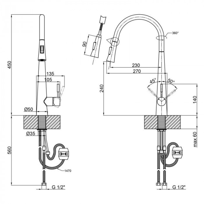 ✅ Удобство выдвижного излива: Длина выдвижного шланга 1470 мм позволяет с легкостью мыть посуду любых размеров и очищать даже самые труднодоступные уголки раковины. 🧼