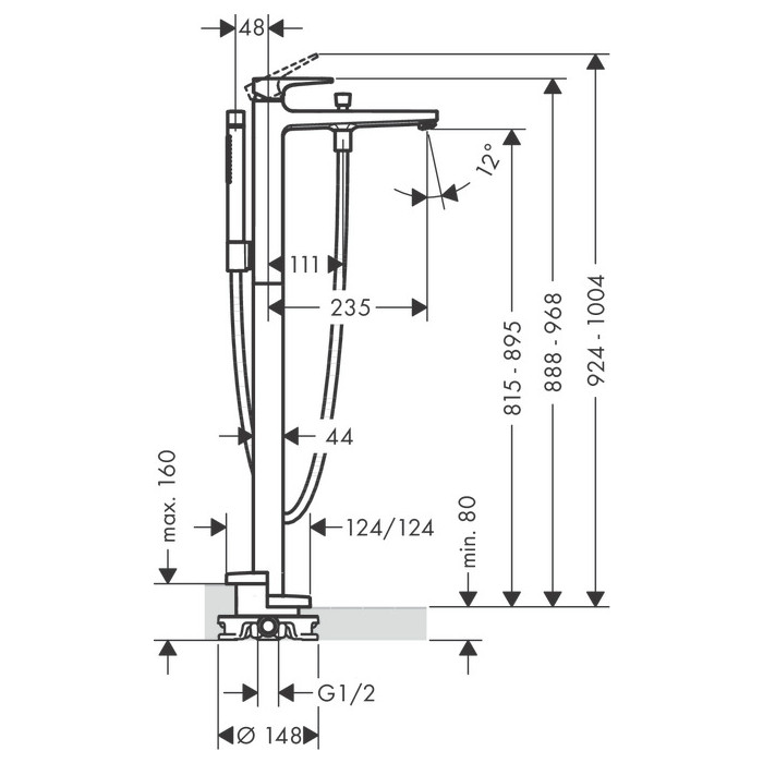 состоит из: смеситель для ванны напольный, ручной душ-«палочка», шланг для душа, держатель для душа