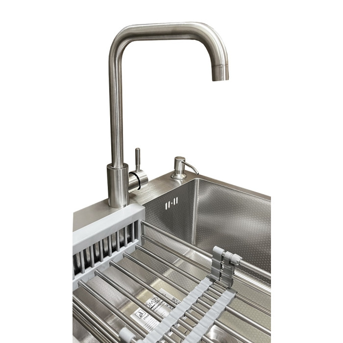 | ✅ Змішувач | Одноважільний, з нержавіючої сталі, поворотний вилив (довжина 21 см, висота 25 см) |