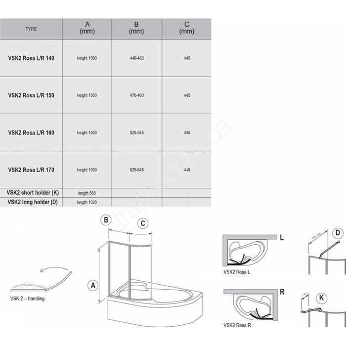 Штора для ванн встановлюється на ванни Rosa I, Rosa II і Rosa 95 подібного розміру та Л/П варіантів - (н-р, VSK2 Rosa 140 L підходить до ванни Rosa I 140 L). Штора складається з нерухомої та рухомої частини, що повертається всередину ванни. Конструкція складена з товстостінних алюмінієвих профілів з якісною поверхневою обробкою та максимальною герметичністю. Стандартна висота штори 1500 мм. Для кращої фіксації штору VSK2 Rosa рекомендуємо зміцнити за допомогою короткого або довгого тримача VSK2, які необхідно докупити окремо – не входять до комплектації виробу. Можливе виготовлення атипової штори для ванни.