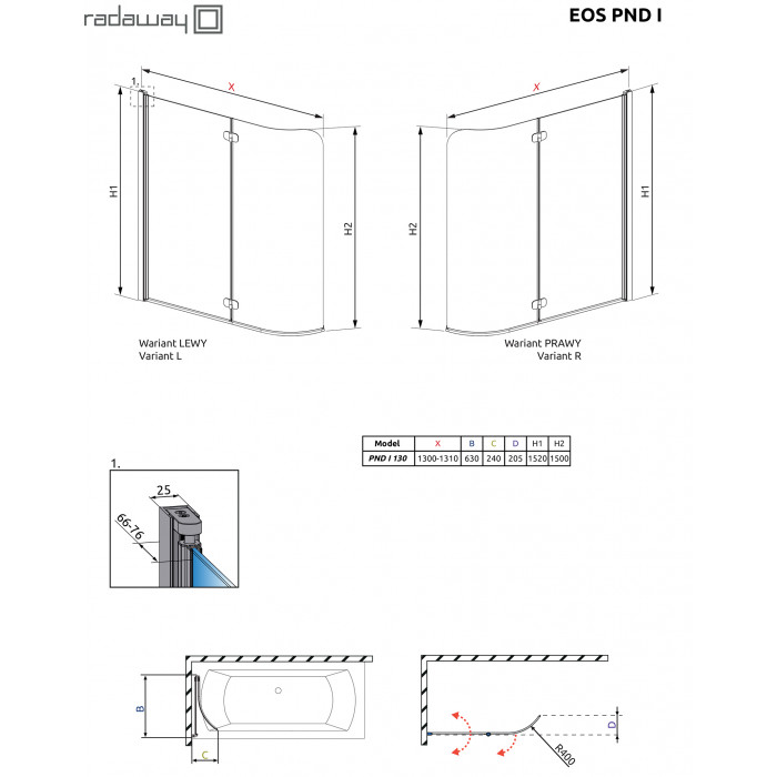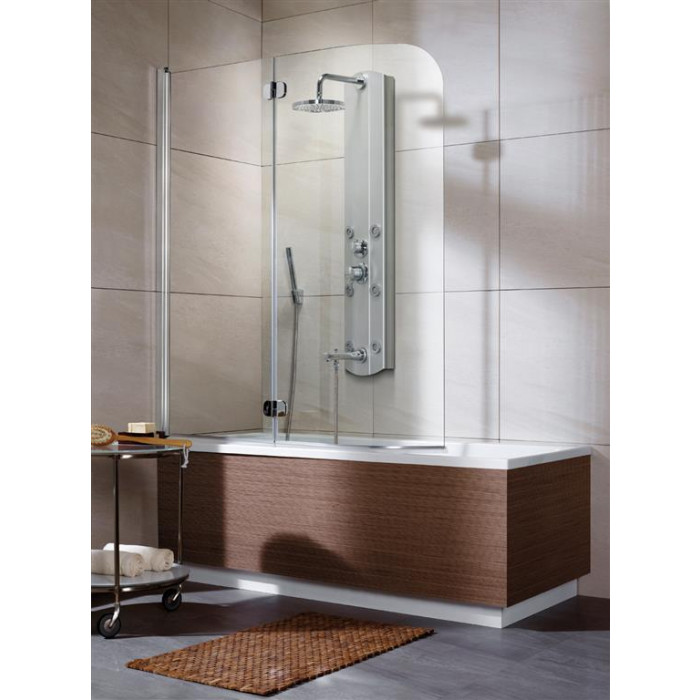 Двостулкова шторка для ванни Eos PND — шторка складається посередині всередину ванни, скло ближче за стіну повертається всередину і назовні ванни.