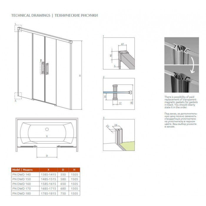 Скло кріпиться до стіни за допомогою пристінних профілів (з регулюванням).