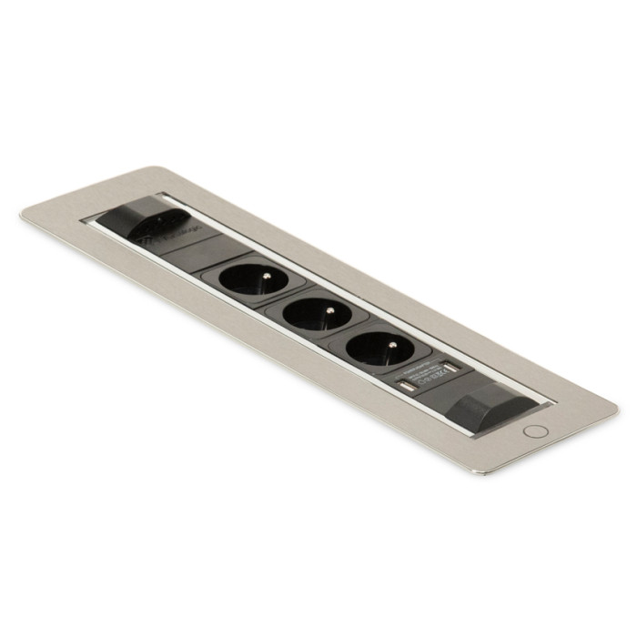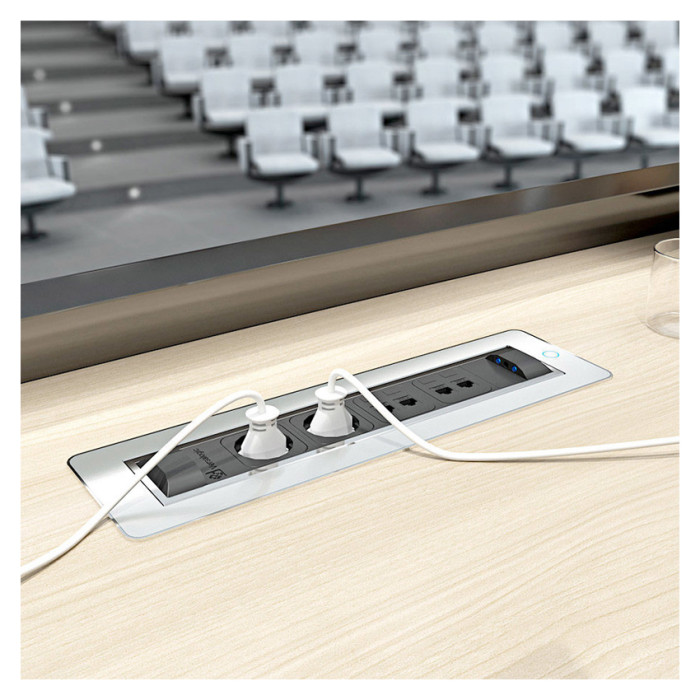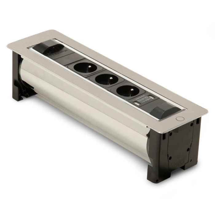 Премиальный розеточный блок с автоматическим вращением, запускается сенсорной кнопкой, встроен как в горизонтальную, так и в вертикальную рабочую поверхность. Предназначен для презентабельных конференц-залов и переговорных комнат, повышает уровень мебели руководителя. Часто используется в оснащении элитных кухонных и кабинетных мебельных гарнитуров.